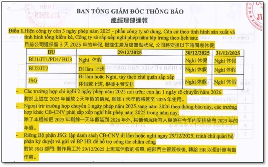 HR xin ban hành thông báo A04-JSGHRMA-2025-084 về việc điều chỉnh lịch nghỉ phép năm 2025 và nghỉ tết dương lịch 01/01/2026