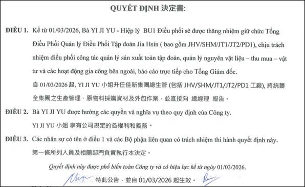 HR xin ban hành quyết định A04- JSGHRMA-2026-016 về việc phân công công việc cho Bà YI JI YU kể từ ngày 01/03/2026